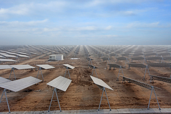 寧夏中衛(wèi)并網(wǎng)光伏電站總規(guī)模:太陽(yáng)能光伏電池組件裝機(jī)容量共60MWp,一二期電站工程采用恩菲自主研發(fā)的8°角斜單軸智能柔性聯(lián)動(dòng)追日跟蹤系統(tǒng),于2011年12月并網(wǎng)并投入運(yùn)營(yíng);三期電站工程采用固定式支架安裝方式,于2013年1月并網(wǎng)并投入運(yùn)營(yíng)。