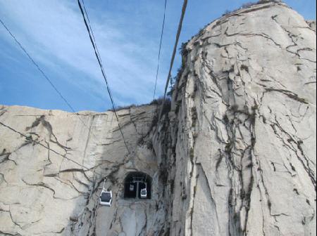 索道線路由兩段組成,既可分別獨立運行,又可通過中間站推車系統(tǒng)進(jìn)行有效銜接,并成一條大索道整體運行。索道線路側(cè)型極為復(fù)雜,兩處爬坡角達(dá)到規(guī)范規(guī)定的上限值45°;索道運載索直徑達(dá)到56毫米,為我國現(xiàn)有索道中最粗的鋼絲繩;索道上站迂回輪張力和達(dá)到105噸;上站在西峰絕壁上鑿洞而建,在國內(nèi)尚屬首例,在國外也不多見。因應(yīng)地形條件,中間站采用地下車庫自動升降收發(fā)車系統(tǒng);采用三套水平救護(hù)系統(tǒng),可在極端情況下保證游客的安全。